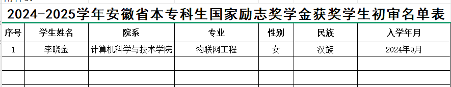 根据安徽省教育厅《关于做好2024—2025学年度普通高等学校国家励志奖学金、评审及材料报送等有关工作的通知》以及《安徽工业大学家庭经济困难学生资助工作条例》的文件精神,遵循公平、公正、公开的原则。在同学申请的基础上,经过各班级测评,学院测评小组的评定,决定推荐李晓金同学为国家励志奖学金候选人,名单如下: