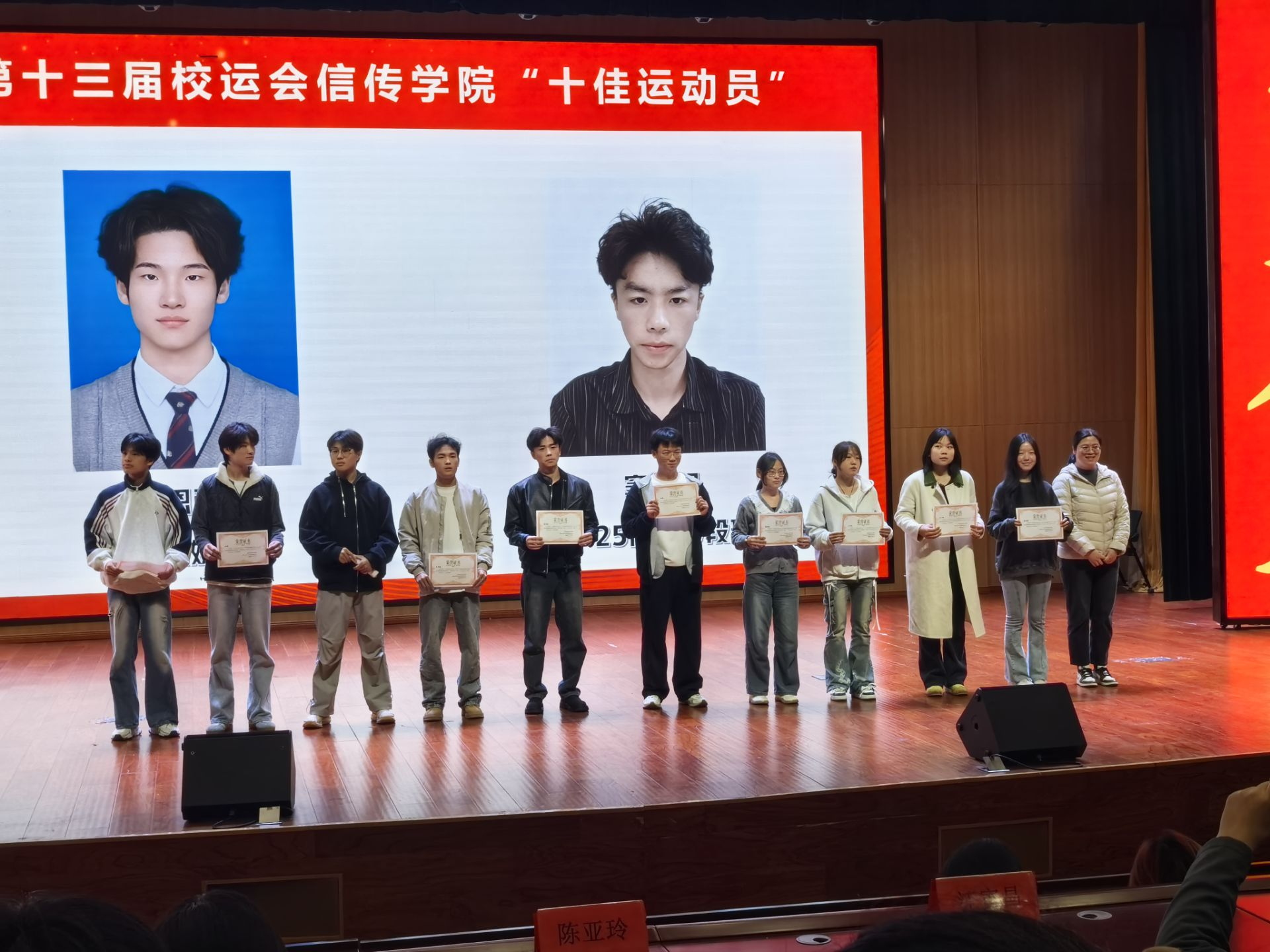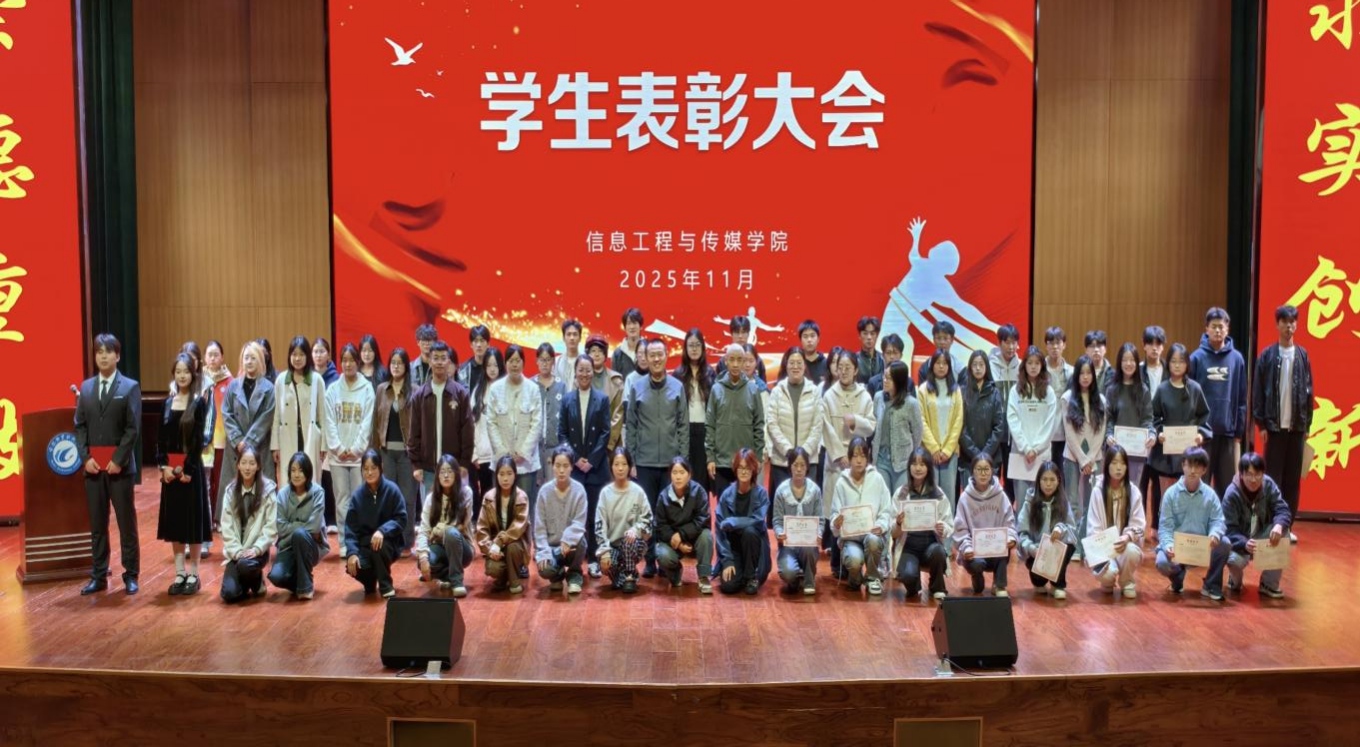 为表彰先进、树立榜样,激发学生的学习热情和进取精神,11月12日下午,信息工程与传媒学院学生表彰大会于汇心湖校区大学生活动中心举行。24级、25级全体学生及辅导员共同参与。大会分别为2024-2025学年国家励志奖学金学生代表、优秀学生干部代表、三好学生代表、先进班集体代表、文明宿舍代表和校第十三届田径运动会信传学院十佳运动员、十佳志愿者、突出运动员、先锋班集体进行颁奖。