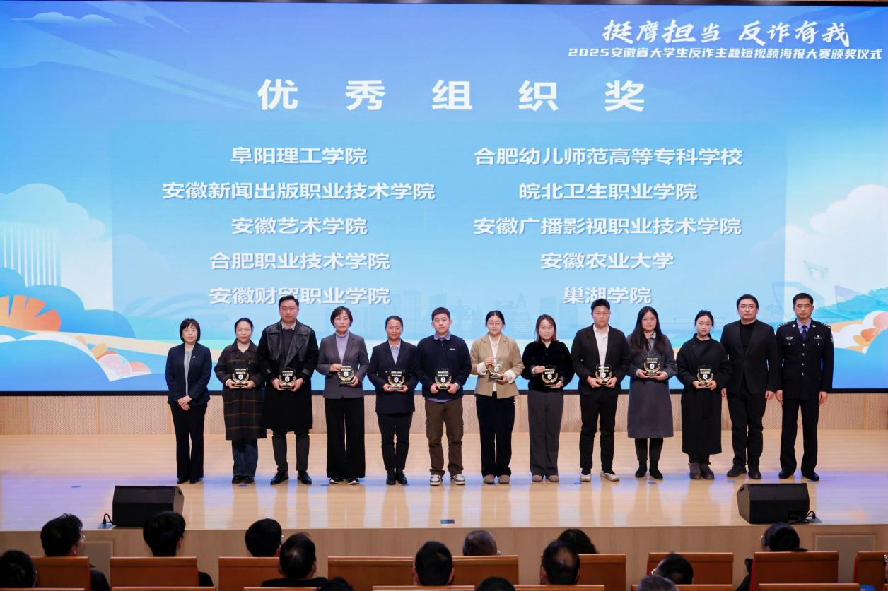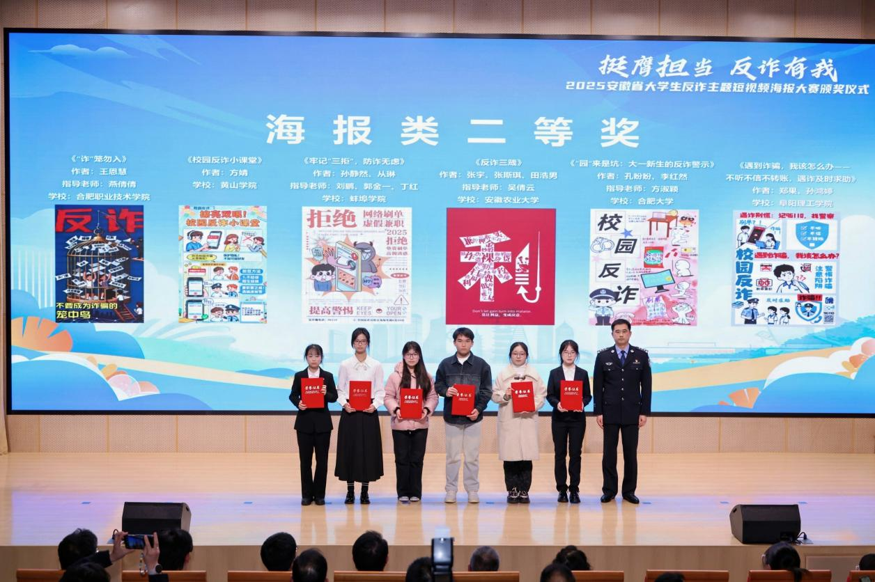 近日,由安徽省通信管理局、安徽省公安厅、安徽省教育厅、共青团安徽省委员会、安徽省学生联合会等部门联合主办的2025年全省大学生反诈主题短视频海报大赛评选结果揭晓,信息工程与传媒学院2025级计网班王恩慧同学创作的反诈主题海报作品《“诈”笼勿入》在众多参赛作品中脱颖而出,荣获大赛二等奖,合肥职业技术学院获得“优秀组织奖”。