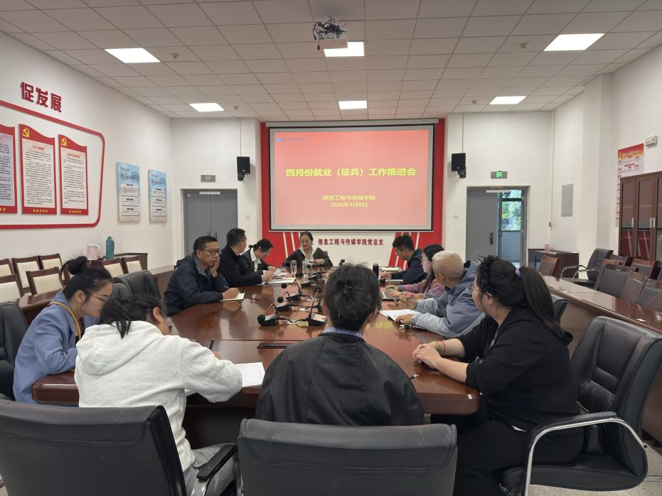 为进一步做好2026届毕业生就业与征兵工作,扎实推进各项任务落实,4月8日下午,信息工程与传媒学院在一楼会议室召开4月份就业(征兵)工作推进会。学院领导、全体毕业班辅导员参加会议。会议由该院党总支副书记江寅昌主持。