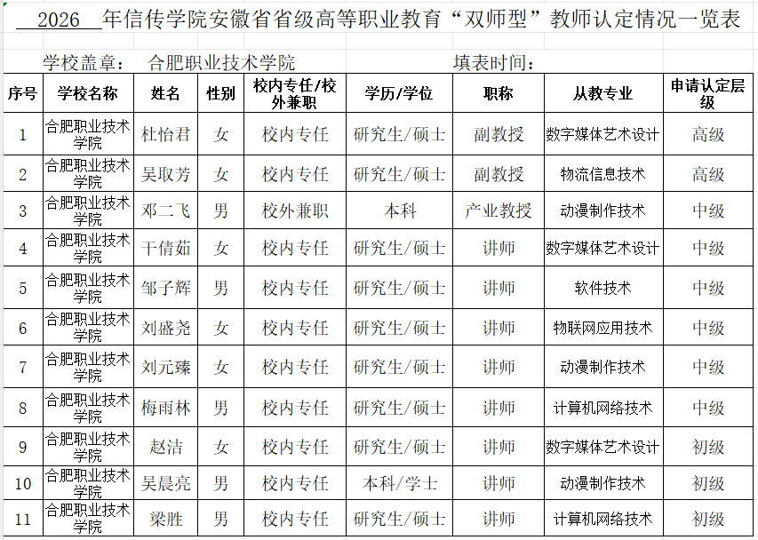 根据组织部《关于做好2026年省级高等职业教育“双师型”教师认定工作的通知》工作要求,信息工程与传媒学院经个人申请、专业带头人初审、教务处审核人培和课程标准材料,审核结果报学院党政联席会审议通过,杜怡君等11人符合申报条件和资质,拟推荐名单如下: