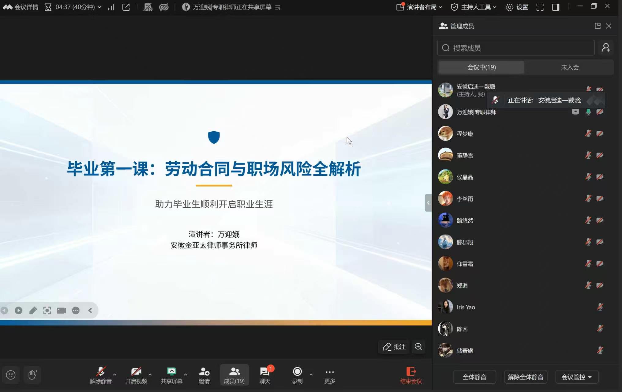 23 级数字媒体艺术设计专业岗位实习即将迎来尾声,为帮助学子明晰劳动合同法律要点、规避职场常见风险、平稳步入职业生涯,近日,该专业《岗位实习》课堂上,行业导师戴老师特邀安徽金亚太律师事务所万迎娥律师,开展劳动合同与职场风险全解析毕业第一课专题分享。
